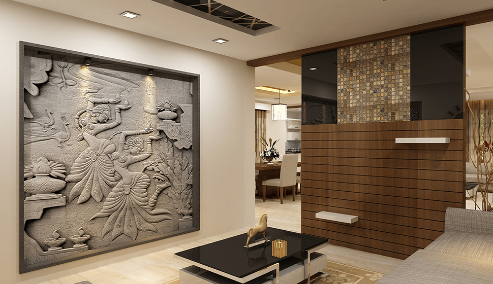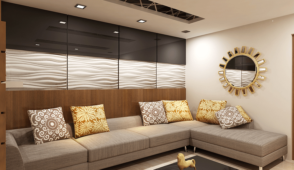 We have experimented with different materials & textures in this house that give a different aesthetic appeal to the spaces. Like the large stone mural in the living area that becomes the main focal point of the area. The paneling behind the sofa is done in 3 materials, tinted mirror, 3d boards and wooden finish.