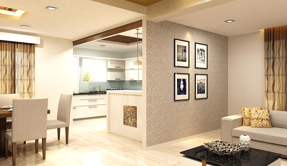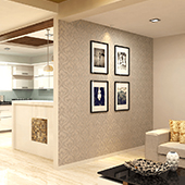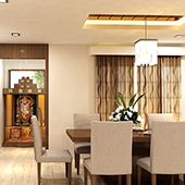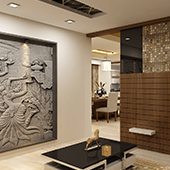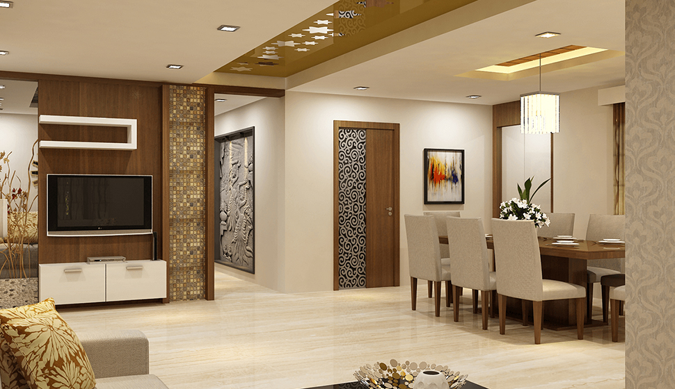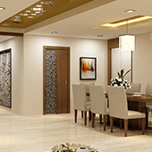 The tv unit in the Family living is sleek and minimal. The partition behind the tv unit that creates a separation between the formal & family living is designed as partially see through at one end and a panel of shimmering mosaics on the other. The dining area feel is kept very subtle through use of neutral tone of brown, only the ceiling having the glitter element.