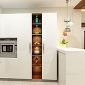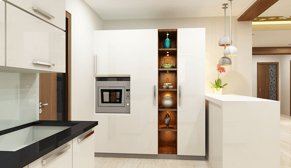 The client wanted an open kitchen which has been kept very subtle in all white and a contrasting sea blue back painted glass backsplash.