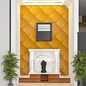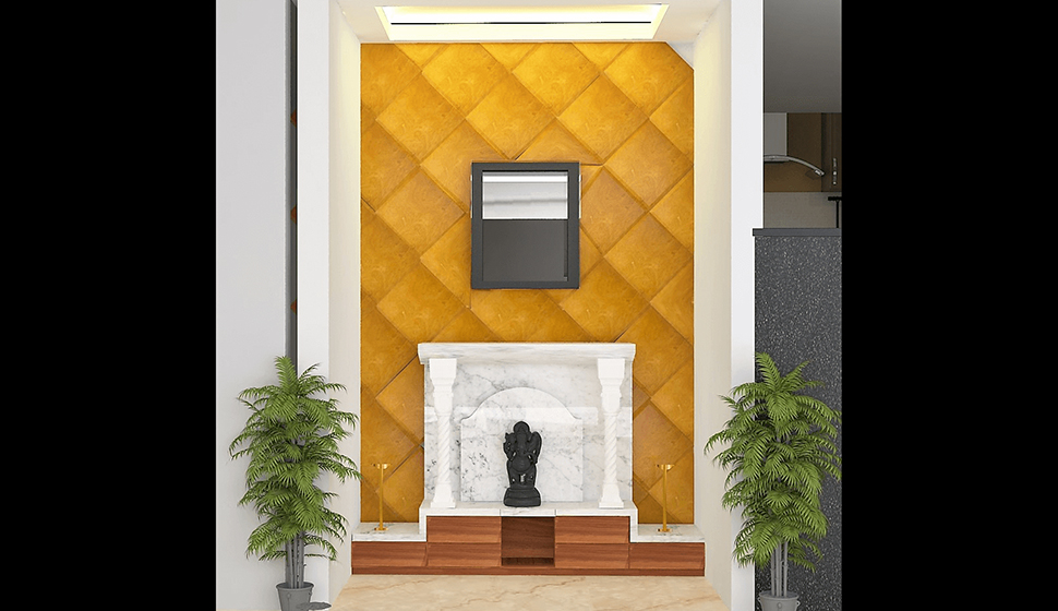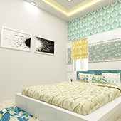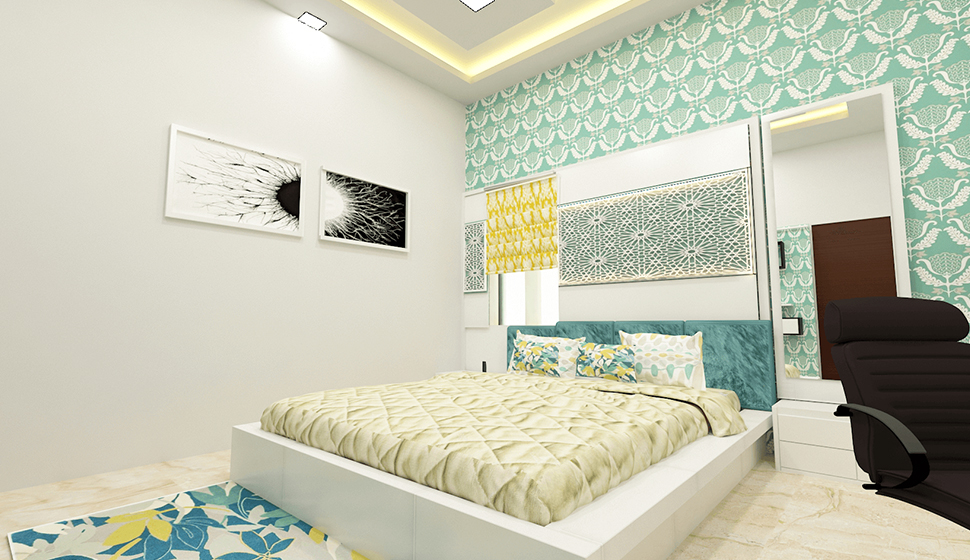 The Master bedroom breaks the use of pink legacy and is a welcome retreat in blue, ochre & white. The sliding wardrobes in black & white balance out the blues & ochre. The jaali acts as a backdrop to the bed with indirect lighting. The layout of the room accommodates all the requirements of a bedroom without looking cluttered.