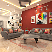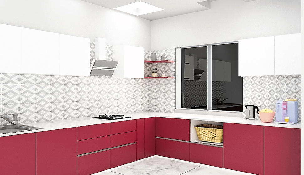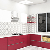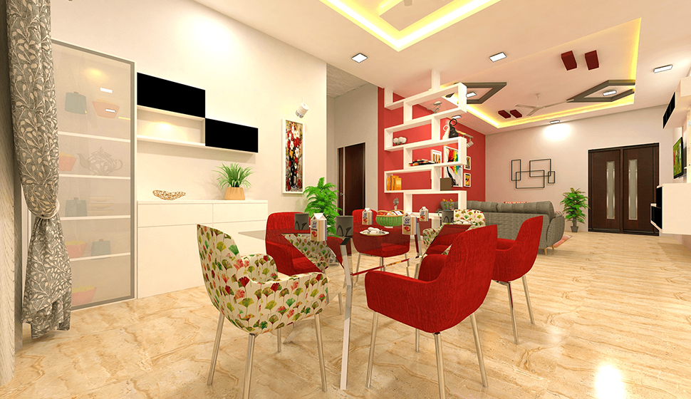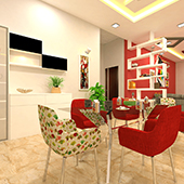 The Living area is an energetic space with a reddish pink backdrop and grey upholstered sofa seating with an accent chair in a bright printed fabric. The partition is an element that is also like a display unit creating a visual separation between the Dining & Living. The Tv unit is Black & White! The contrasting colours compliment each other to make a statement. The Dining table with red upholstered chairs is accented by 2 chairs in a printed fabric that looks stunning. The crockery unit is like an extension to the design language of the furniture. Kitchen in Pink & Red appears very refreshing & neat.