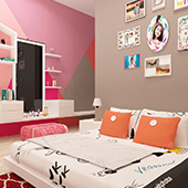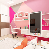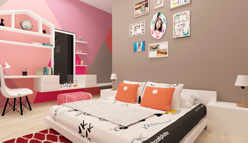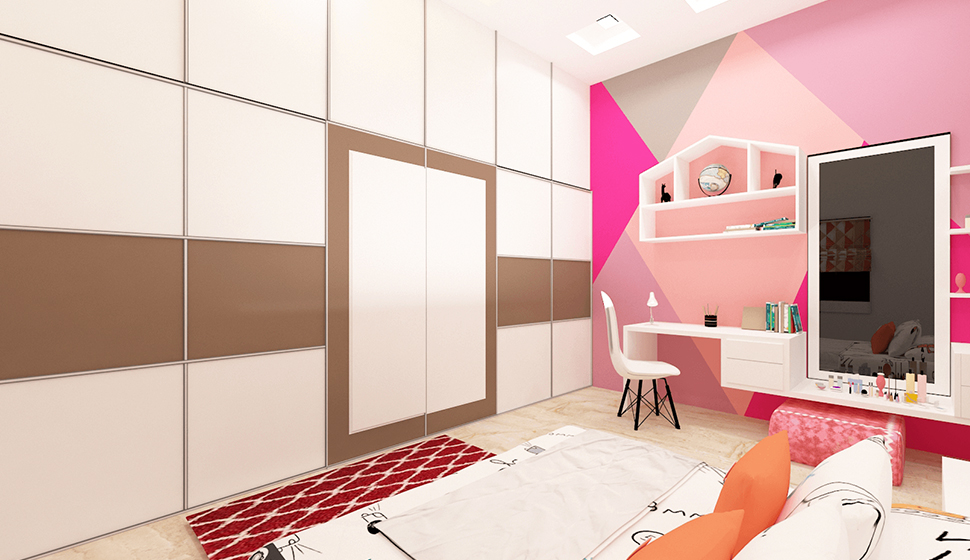 The Children bedroom is our favourite with burst of pink shades. The entire wall from the room entrance till the wardrobe has been treated as a mural wall with abstract pattern. The study table and dressing unit have been designed as a combined unit in the same language. The wardrobes are full length and hence the browns have been very restrictedly used to prevent them from dominating the space. The wall behind the bed displays a collage of the daughter’s pictures which gives a personal touch to the room.