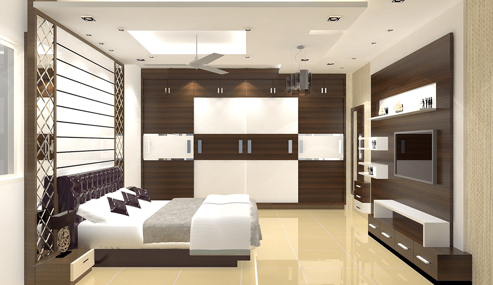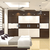 The Master bedroom is a combination of brown & white. Full length sliding wardrobes give ample storage along with lofts. A separate dressing has been provided next to the tv unit. The mirror paneling above the side tables defines the sleeping area in an otherwise large space.