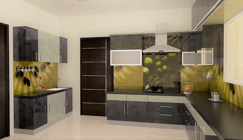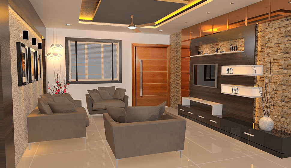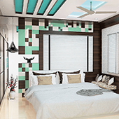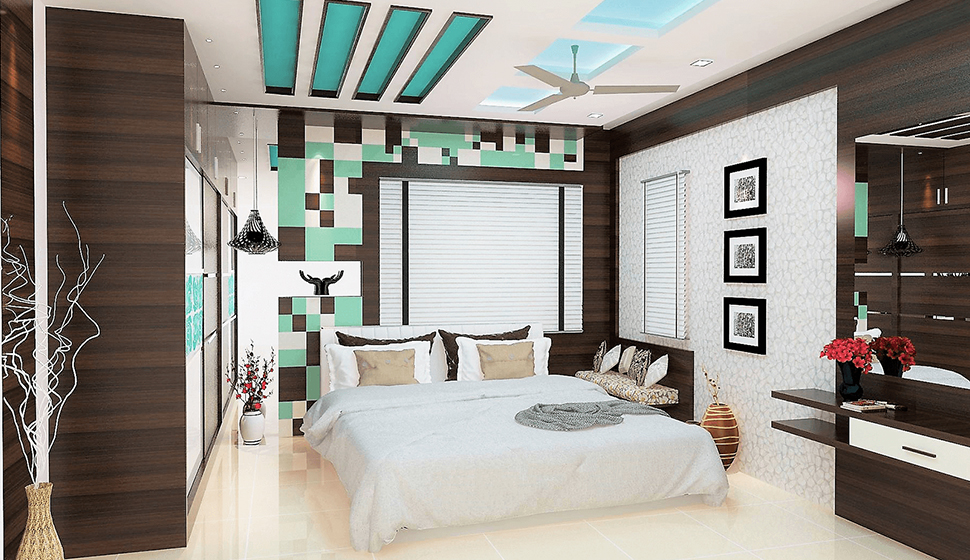 The bedrooms make a shift from the golden towards whites & browns. The Guest bedroom is dominated by brown that was uniquely contrasted with a sea green accent. The same colour has been used in the ceiling as well. The mirror next to the bed gives depth to the room and makes it appear much bigger.