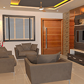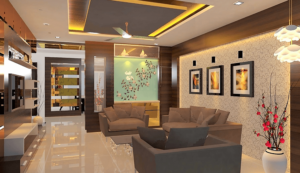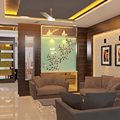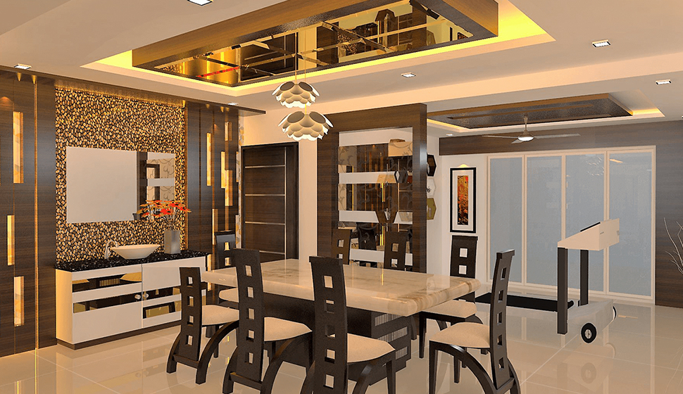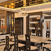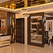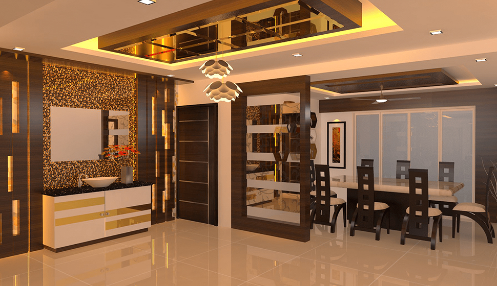This 3BHK goes all out to speak about its own extravaganza! The wooden and browns dominate this house with golden accents. The clients wanted to have a lavish home that impresses its visitors at the very first glance. The elaborate tv unit with peripheral golden tinted mirror paneling, the partition in wood finish and glass with itching pattern, and glass door with golden tint, all of them do just that. The vanity unit near the dining area is another piece to adore with mirror strips on the shutter and wall paneling in patterned tiles and wooden paneling. The indirect lighting helps in creating a mood when guests come over for dinners.
