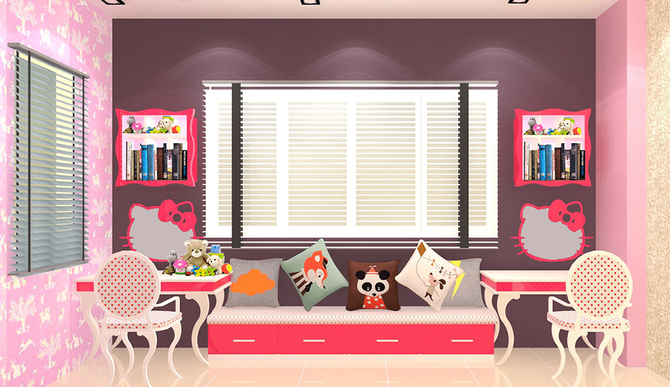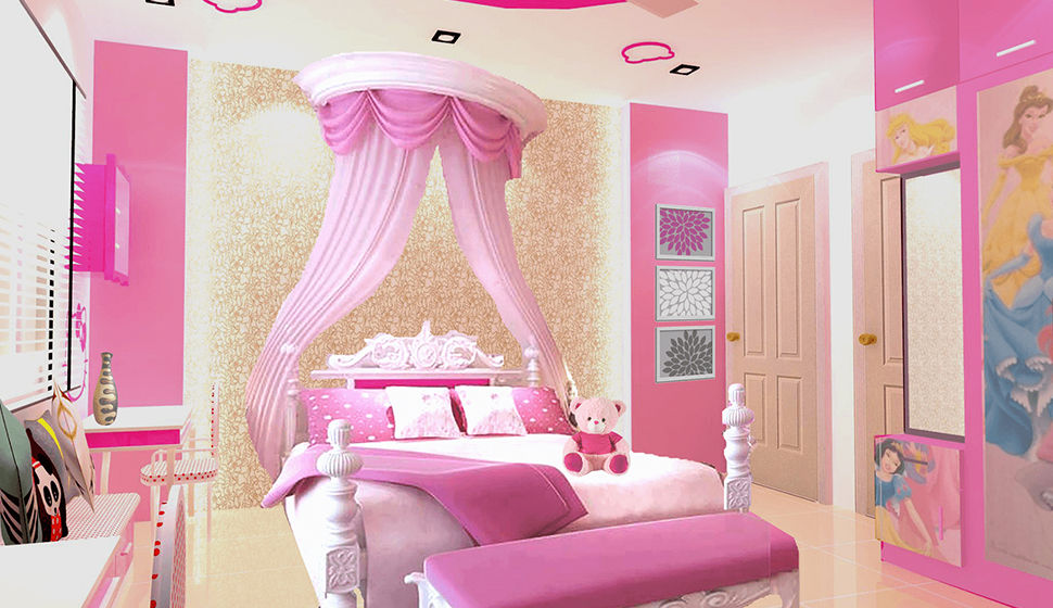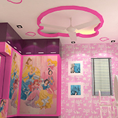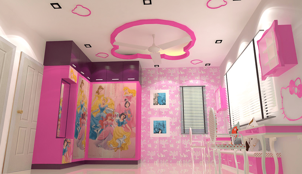 Daughter’s bedroom has been very intricately designed considering the likings of the daughter with each and every furniture reflecting the theme of the entire space. Even the ceiling follows the princess & kitty theme. The canopy bed with curtains gives a royal feel sure to be a princesses’ bed. The room is a personal retreat zone for the girl!