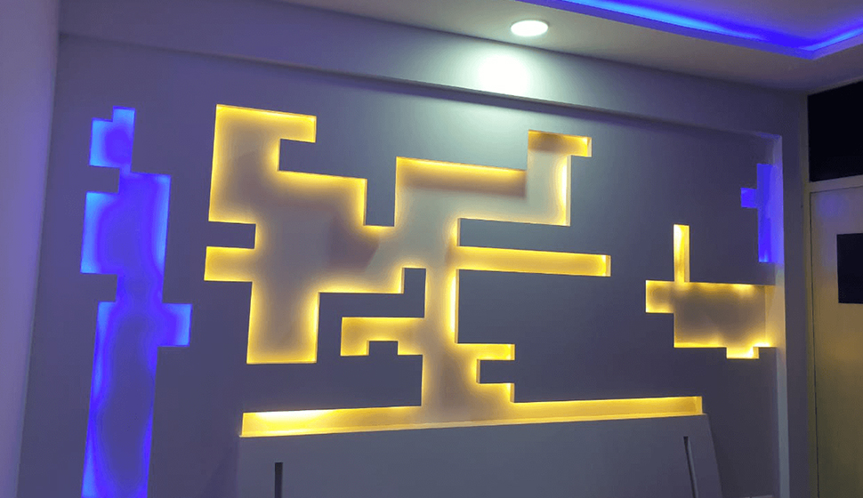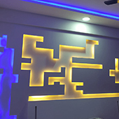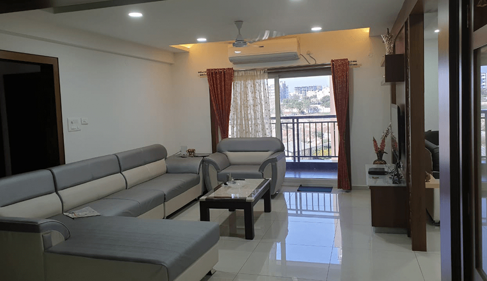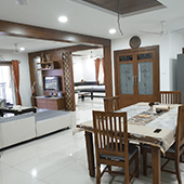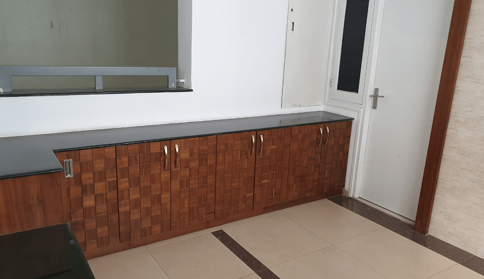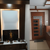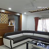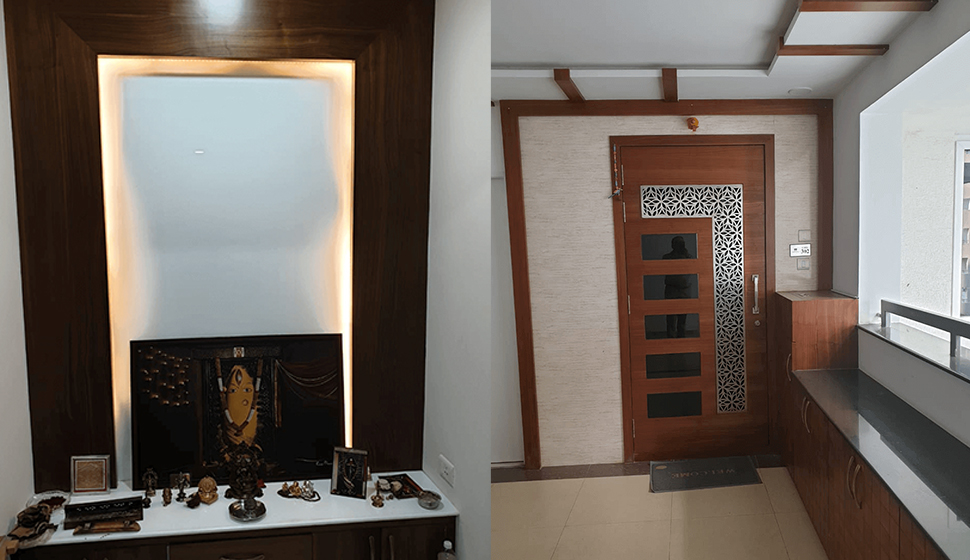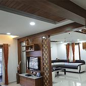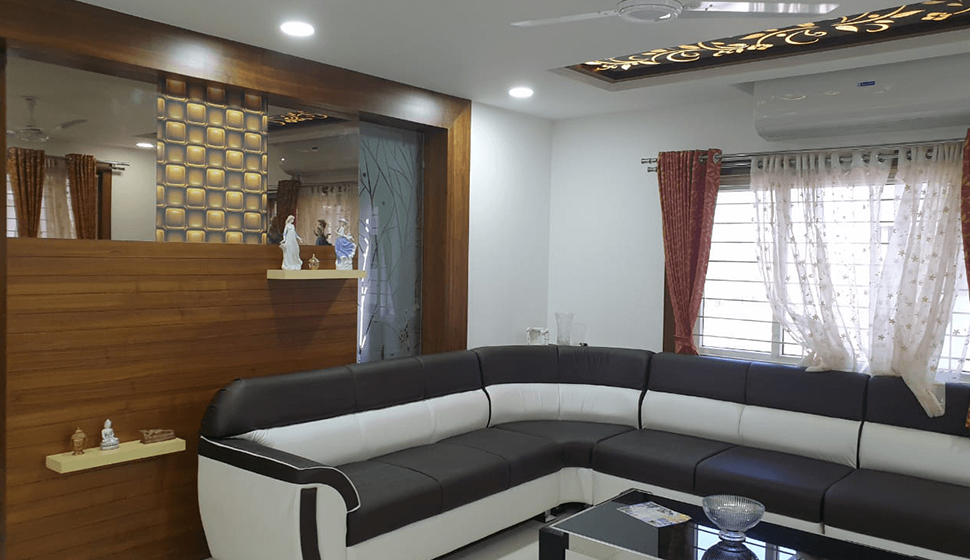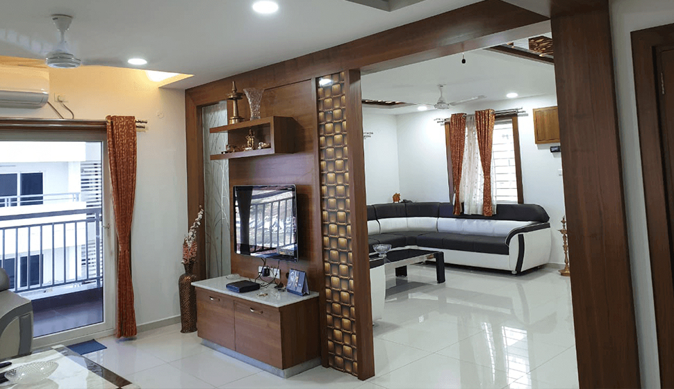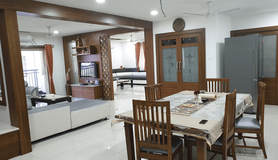 An expansive home that posed a challenge of demarcating a huge space into semiprivate & public zones through design. The Formal Living area and the Family living area are segregated through a wooden partition since the client did not want a direct visual connection between the two. The partition has been designed in a way that it becomes a backdrop for the Tv unit in the Family living area with some interesting elements like the use of glass and textured laminate.