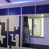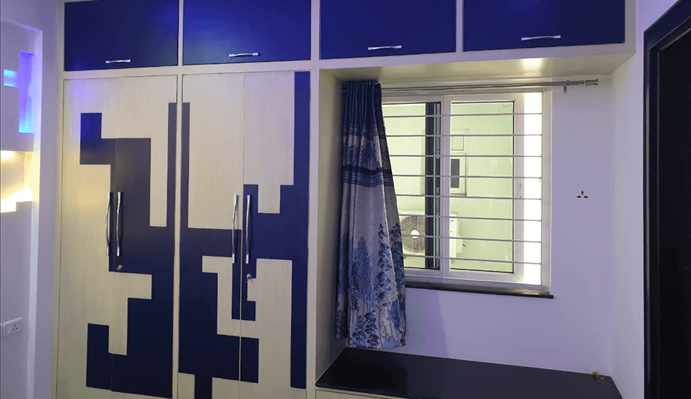 The wooden posts and beam define the Formal Living, Family Living and Dining areas. The client had a liking for wood and hence it has been used at a number of places including the dining table & chairs. However, the sofas for both the living areas have been custom designed as running sofas in black, grey & whites which would break the monotony of the wooden palette. Abstract pattern in the bed backdrop wall creates interesting form when the indirect lights turn on. The same pattern has been used in the wardrobes with contrasting colours.
